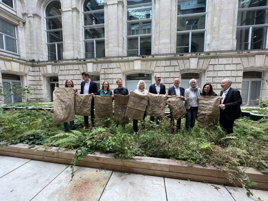 nach dem Verteilen der Erde in der Kunstinstallation im Innenhof des Bundestages. Das Foto zeigt v.l. die Grünen-Abgeordneten: